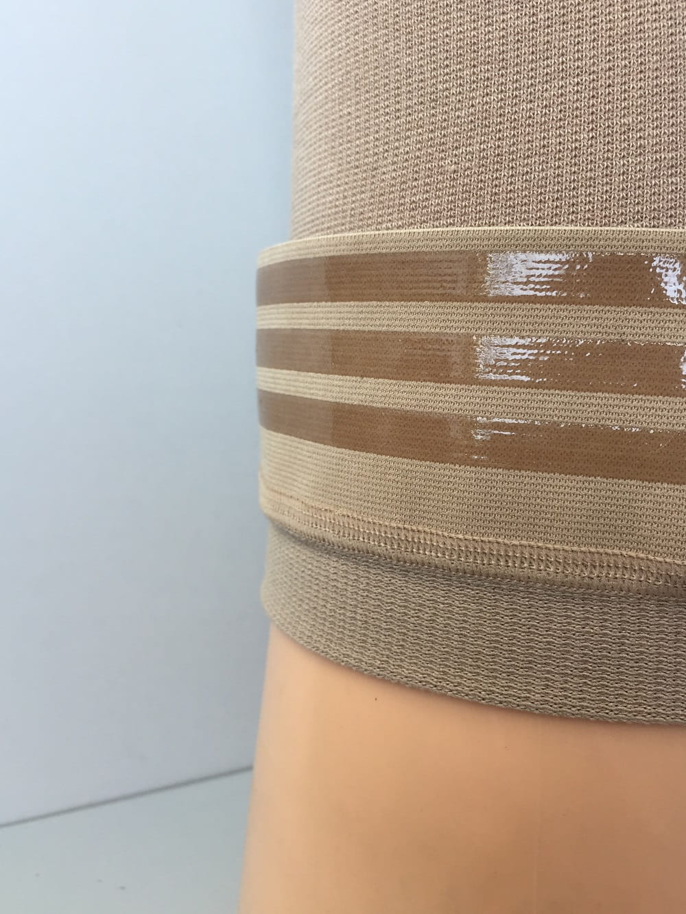 Резинка выполнена немецким производителем из высококачественных материалов. Резинка обладает очень мягкой, пластичной структурой, окрашена в цвет чулок. Для резинки выбрано самое оптимальное нанесение силикона в виде трёх полос, между которыми есть пространство самой резинки для того, чтобы кожа ног могла «дышать» и плотно прилегала к ноге, обеспечивая надёжную фиксацию, предотвращая сползания чулка.